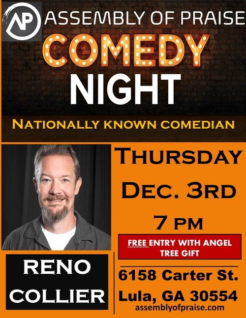 Please join us THURSDAY, DECEMBER 3RD @ 7 PM for COMEDY NIGHT at Assembly of Praise as nationally known comedian RENO COLLIER takes the stage to perform an evening of comedy you're sure to never forget!